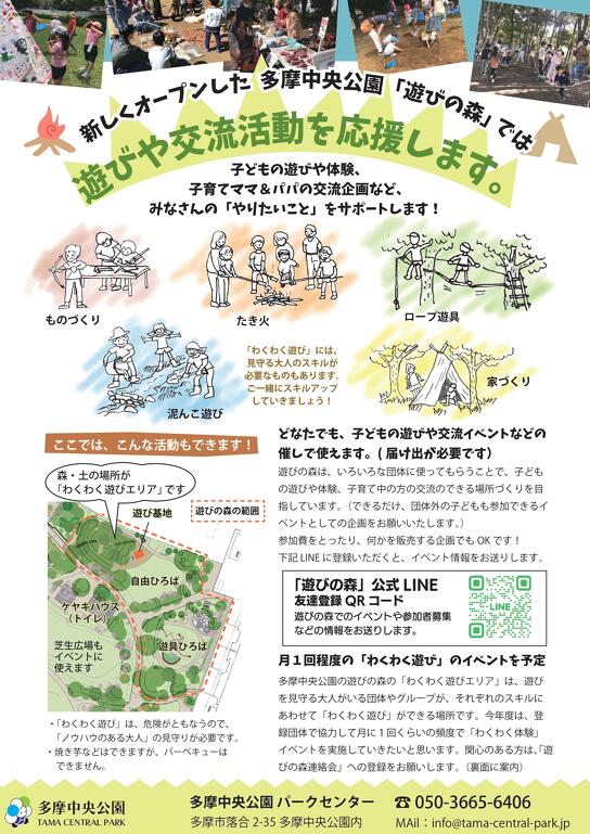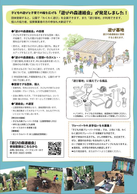 このエリアでは、見守る大人たちがいる事を前提に、普段は制限されがちな「わくわく遊び」が出来るエリアとしての運営を目指し、そのための協力者を募りつつ、相互の情報発信や意見交換を行うためのグループとして「遊びの森連絡会」を発足しています。