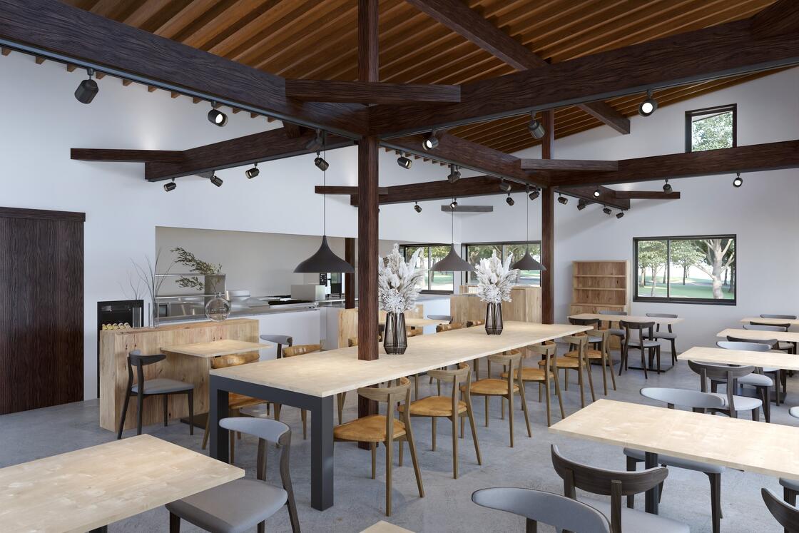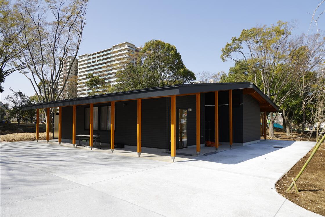 ケヤキハウスはパークセンター、飲食施設、トイレの複合施設です。ケヤキハウスは本公園の核となる賑わい施設である一方、管理運営の拠点となるパークセンター機能も有しています。多くの人が集まる、遊びの森、大芝生広場の間に位置し、公園スタッフが常駐することにより、皆様が安心して過ごせる公園となるよう、防災・防犯機能など多様なサポートが可能となる場所に配置しました。