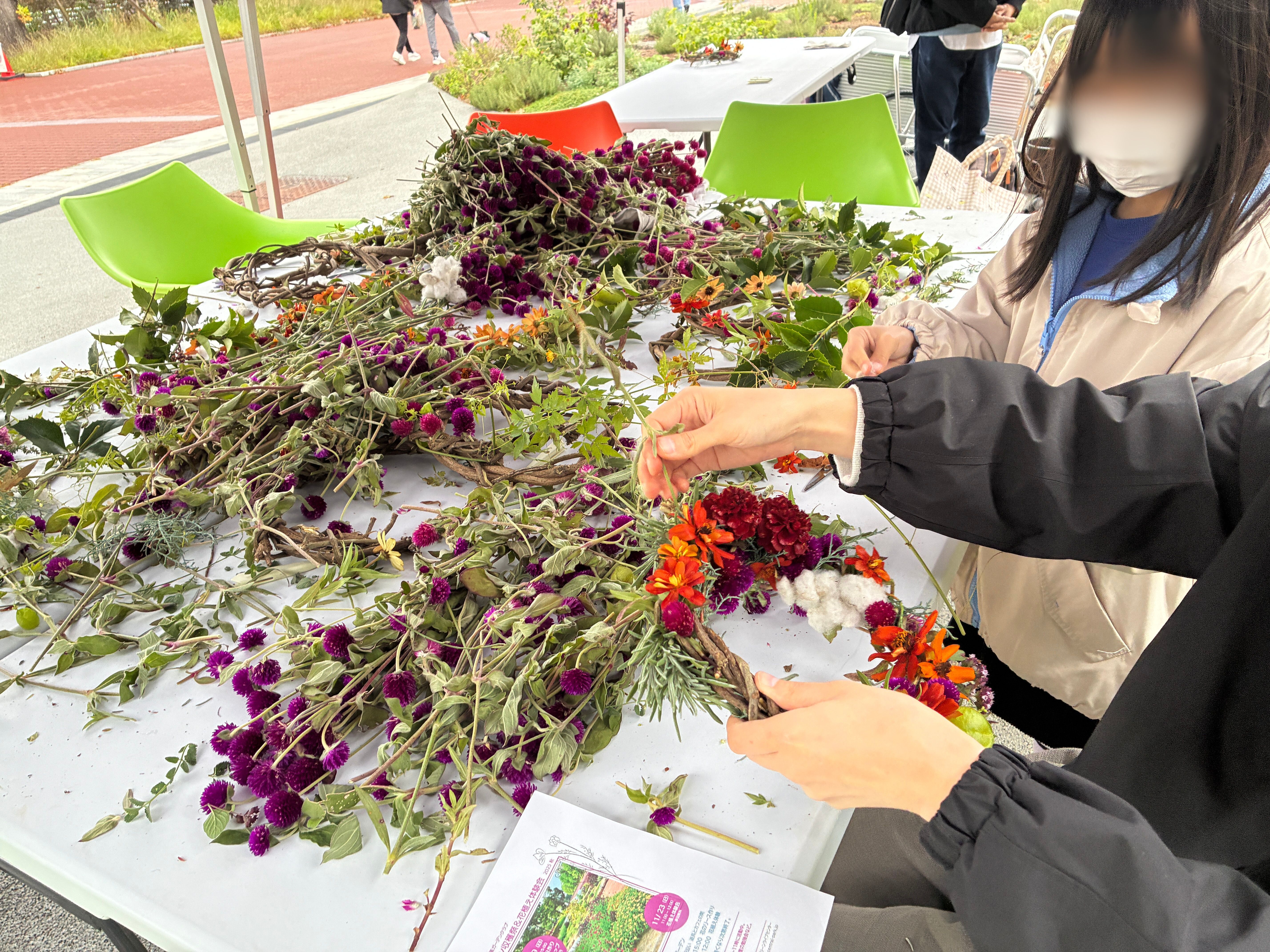 参加者は、センニチコウ、ジニア、マリーゴールドなど色とりどりの花の中から、それぞれ気に入った花を選んで摘み、リースに編み込んでいきました。