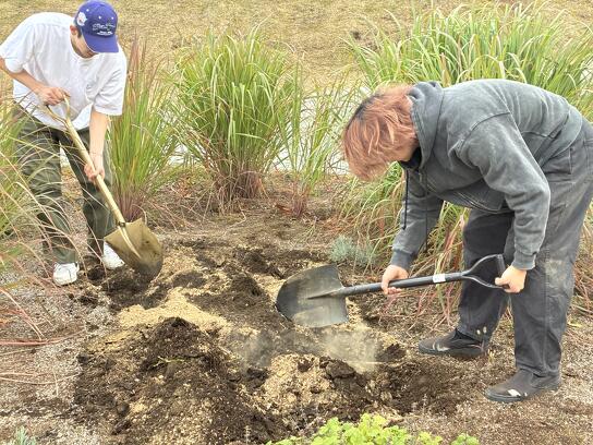 帝京大生が肥料を土に混ぜ込む様子