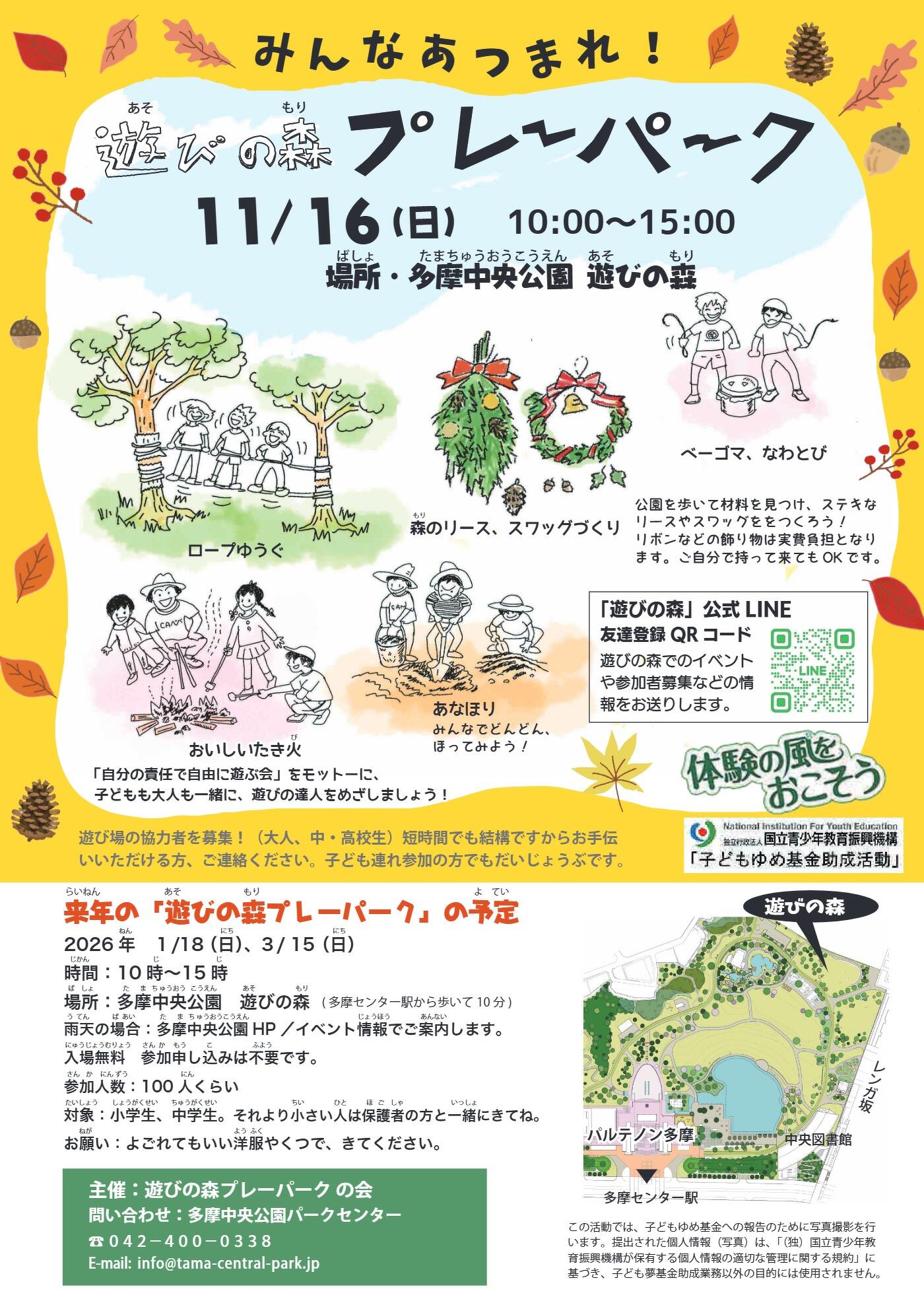 多摩中央公園の遊びの森にて、プレーパークを開催します!