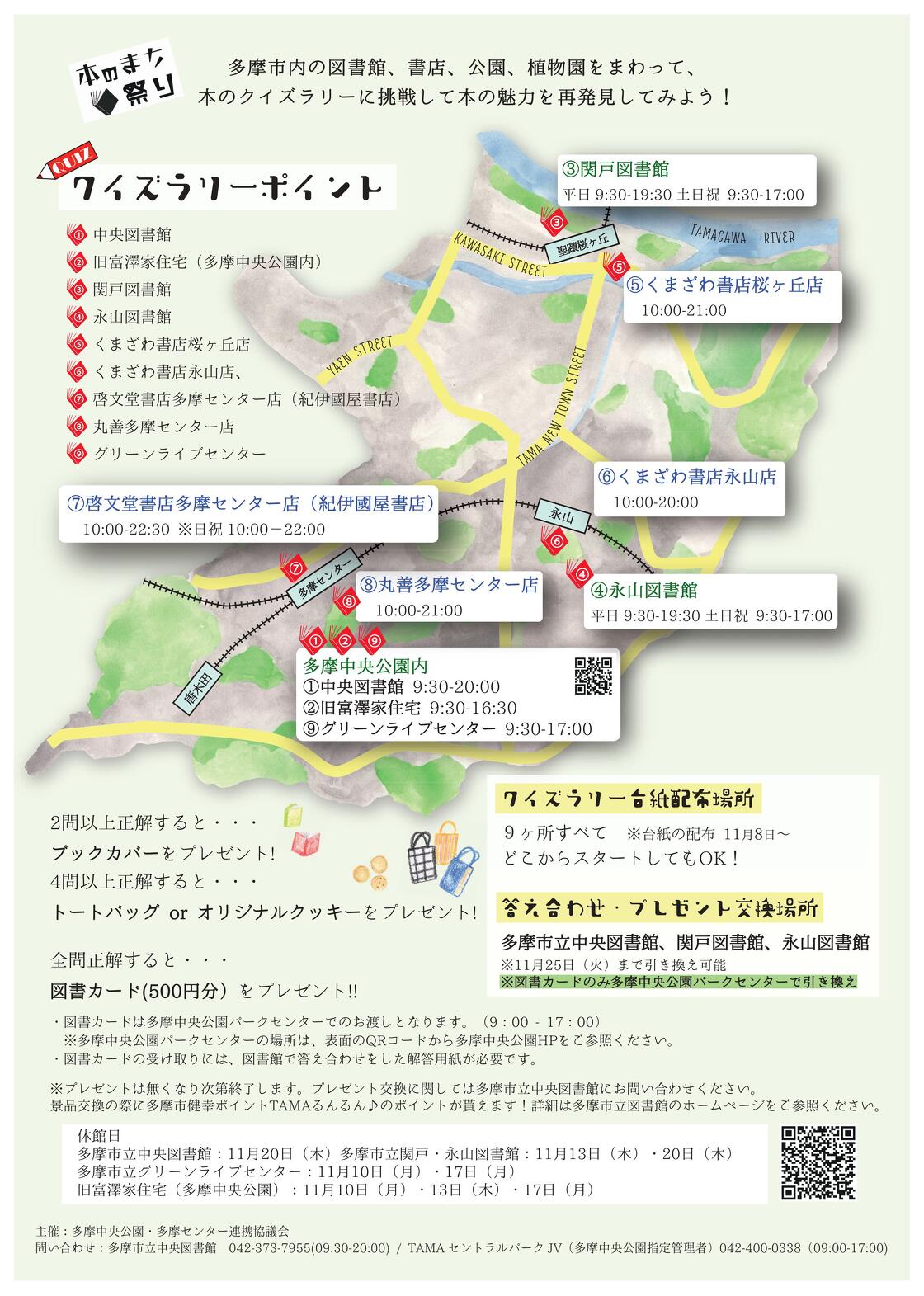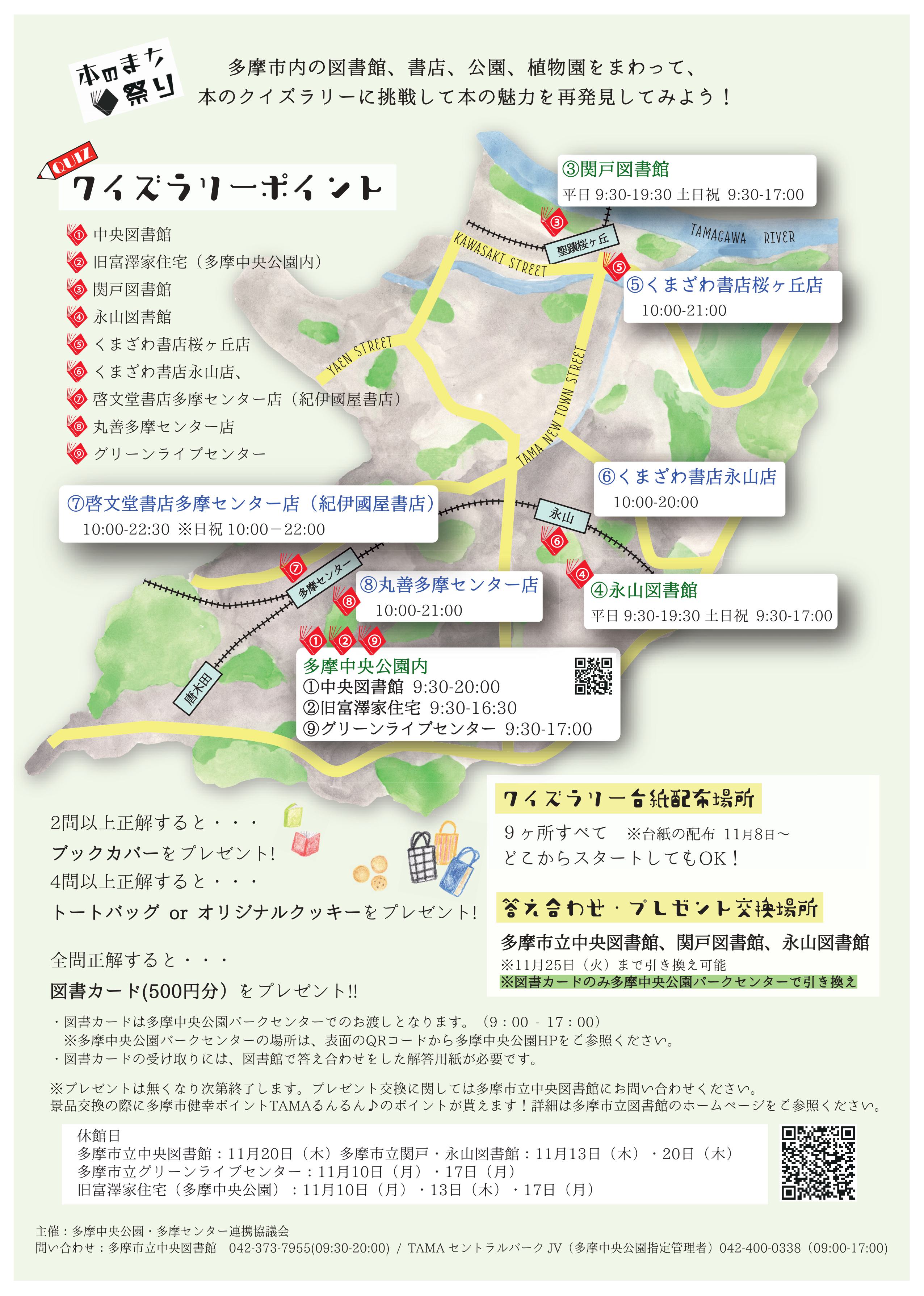多摩市内の図書館、書店、公園、植物園の9つのポイントをまわって、本のクイズラリーに挑戦して本の魅力を再発見してみよう!