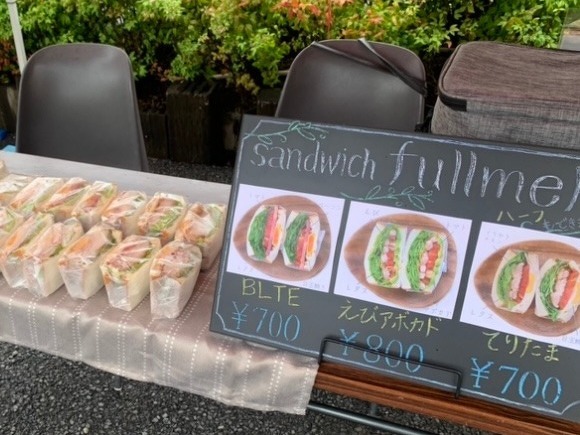 販売品目:たっぷりの野菜や厚切りベーコン、照り焼きチキン、海老、卵等でカラフルな断面が特徴のサンドイッチの販売です。ヘルシーながらもボリュームがたっぷりです。種類はBLT、てりたま、海老アボカドの3種類で、価格は2つで700円です。
