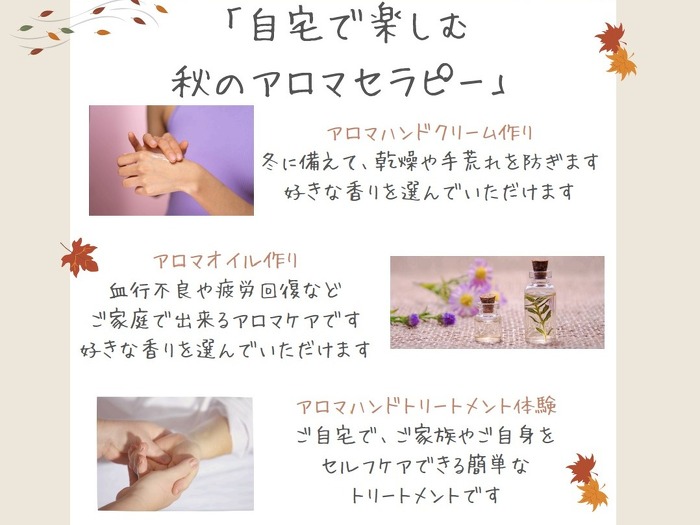 「自宅で楽しむ秋のアロマセラピー」 季節の変わり目のケアに、天然の植物から採取した精油(アロマ)を選んで 簡単に作れるアロマオイル、又はハンドクリームを一緒に楽しく作りましょう。 ご希望で、ハンドトリートメントもサービス価格で体験いただけます。 生活の中で香りを身近に楽しんで、秋を満喫していきましょう!