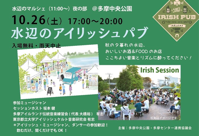 水辺のマルシェの夜の部。腕自慢のミュージシャンたちのアイリッシュ・セッションを聴きながら、おいしいお酒とおつまみを楽しめる「パブ」を開きます。