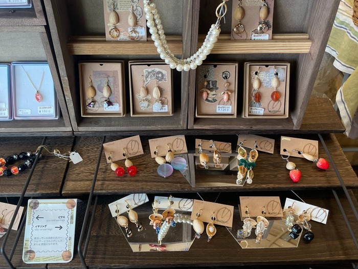 販売品目:ピスタチオのカラを使用して作ったピアスやイヤリング、ブローチなどを作って販売しています。