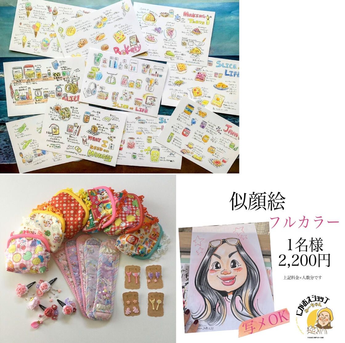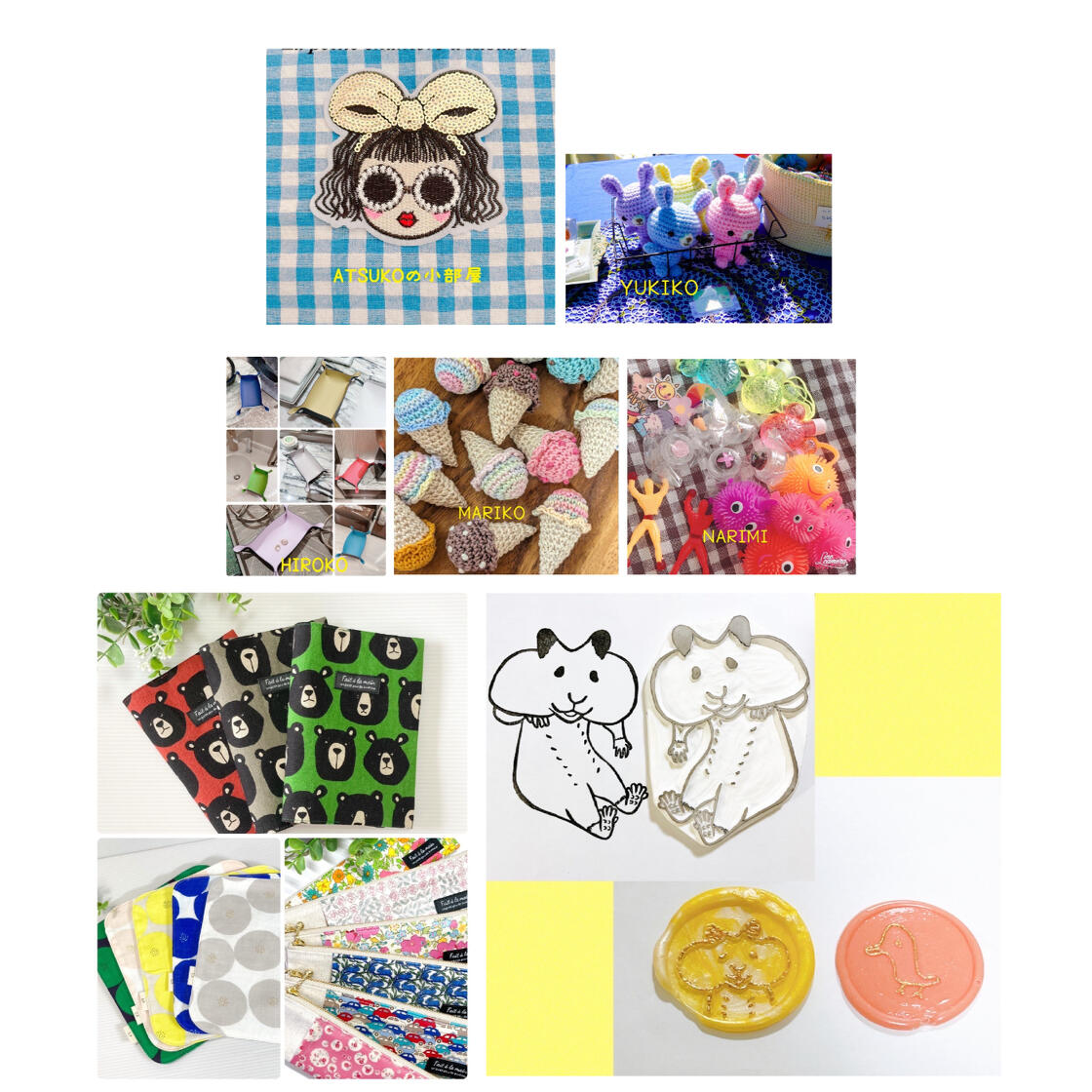 販売品目:あみもの小物、カード、くじ引き、おもちゃ、レザートレイ&クリップ、ドリンクホルダー、布小物