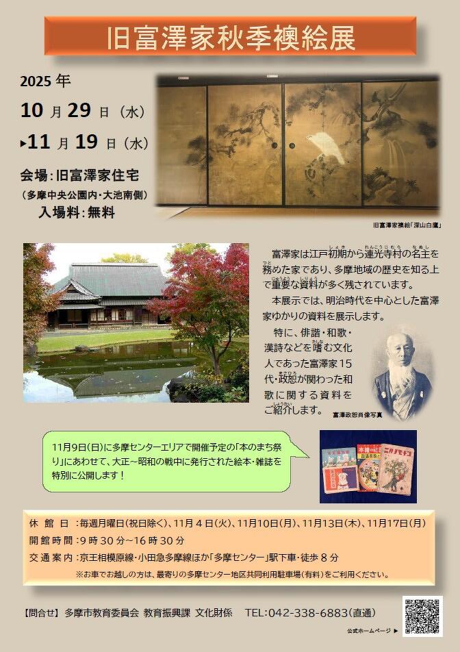 2025年10月27日(月) 旧富澤家秋季襖絵展 開催のお知らせ 開催期間 2025年10月29日(水)~11月19日(水) ※旧富澤家の休館日をよくご確認の上、ご来館ください。 休館日:毎週月曜日(祝日を除く)、11/4, 11/10, 11/13, 11/17 多摩市ホームページ https://www.city.tama.lg.jp/kanko/event/1018703.html