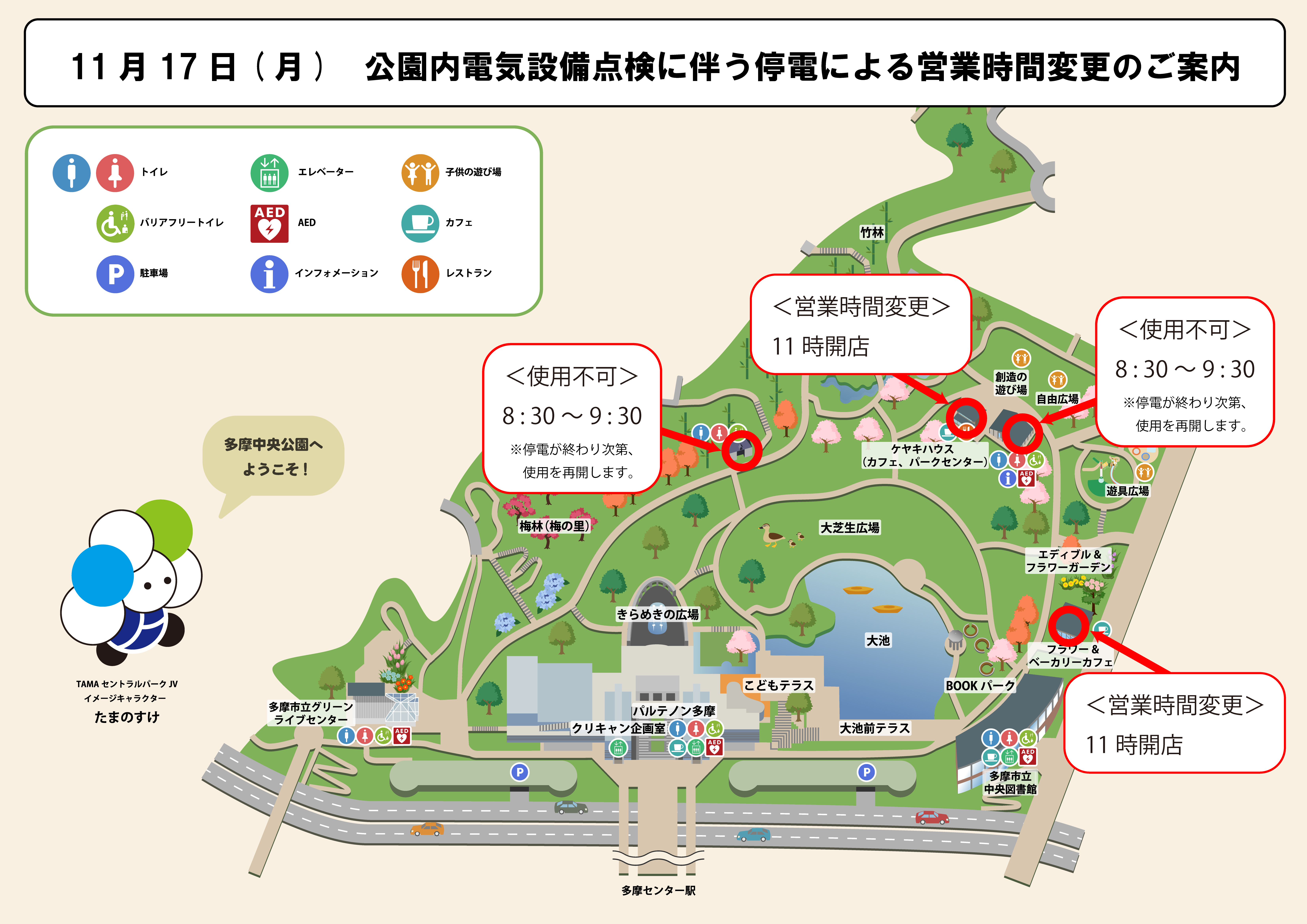 2025年11月10日(月) 11月17日(月) 多摩中央公園停電作業のお知らせ いつも多摩中央公園をご利用いただき、誠にありがとうございます。 11月17日(月)は、電気設備点検の実施に伴い、園内で一時的に停電が発生いたします。 このため、下記の施設では利用できない時間帯や営業時間の変更がございます。 ご利用の皆さまにはご不便をおかけしますが、安全確認のための作業となりますので、 何卒ご理解とご協力をお願いいたします。 対象施設 影響内容 対応時間 公園内トイレ(2箇所) 使用不可 8:30~9:30 44apartment 営業時間の変更 11時開店 balder coffeeTAMA / buire 営業時間の変更 11時開店